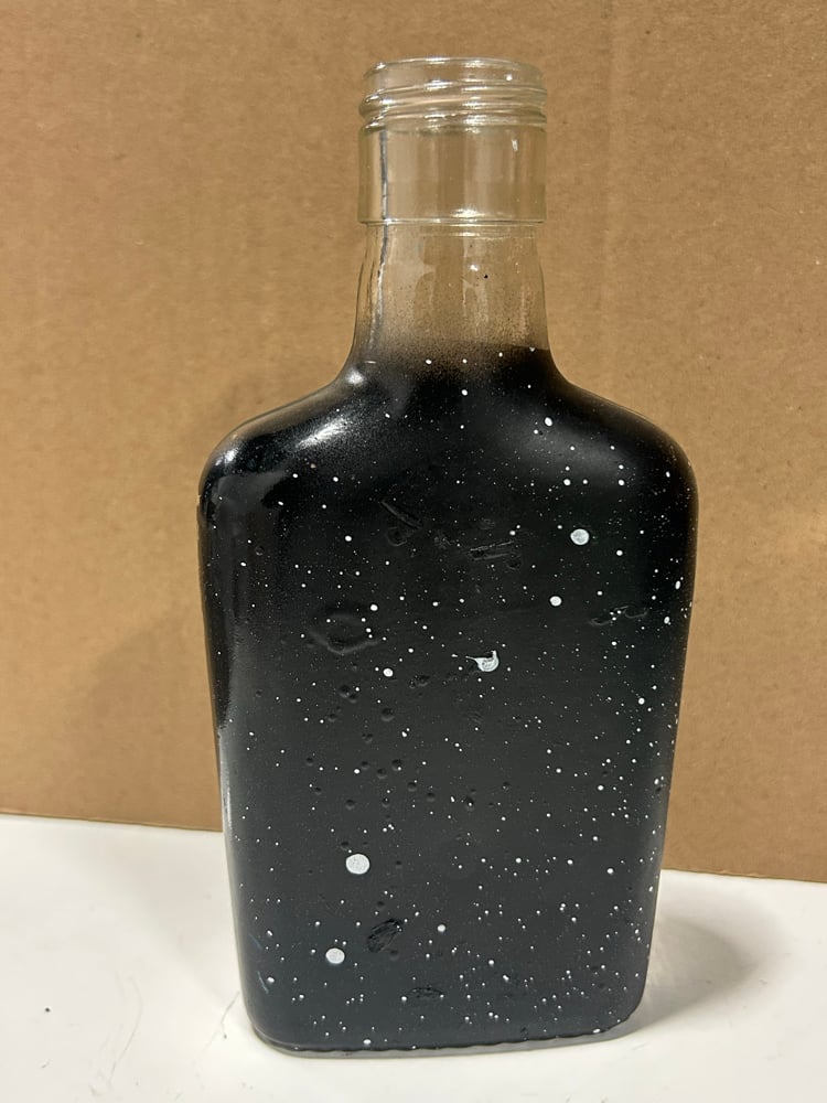 Acrylic and latex paint on found glass pint bottle.